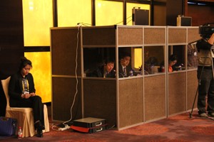 交傳, 是譯員在講話人講完一句、一個意群、一段甚至整篇后譯出目標語言的翻譯方式。兩會期間舉行的新聞發(fā)布會采用的都是交傳。和同傳比較起來,交傳時譯員是和聽者直接見面的,因而受到的關注比較多,心理壓力也相對較大;同時,由于譯員有一定的時間對源語言(句、意群、段或篇)的整體內(nèi)容進行理解并在組織譯文的過程中對結構做出必要的調(diào)整,通常大家預期的翻譯質量也會比較高。鑒于這兩點,交傳的難度相對較大,同時它也更能反映出翻譯的水平。
