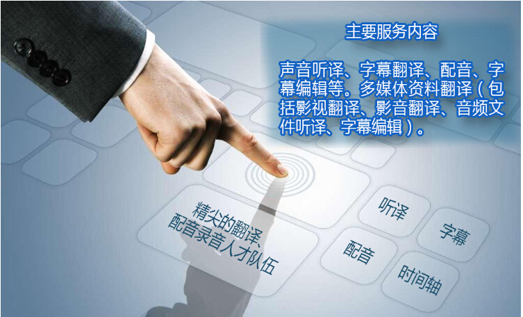 此項(xiàng)服務(wù)包括視頻資料加字幕,各語種的廣播級專業(yè)男女聲配音,優(yōu)意通公司擁有專門用于音視頻處理的廣播質(zhì)量及制作設(shè)備。錄制過程中,由專業(yè)翻譯人員提供翻譯腳本,同時(shí)還配有該語種的專業(yè)人員指導(dǎo):
